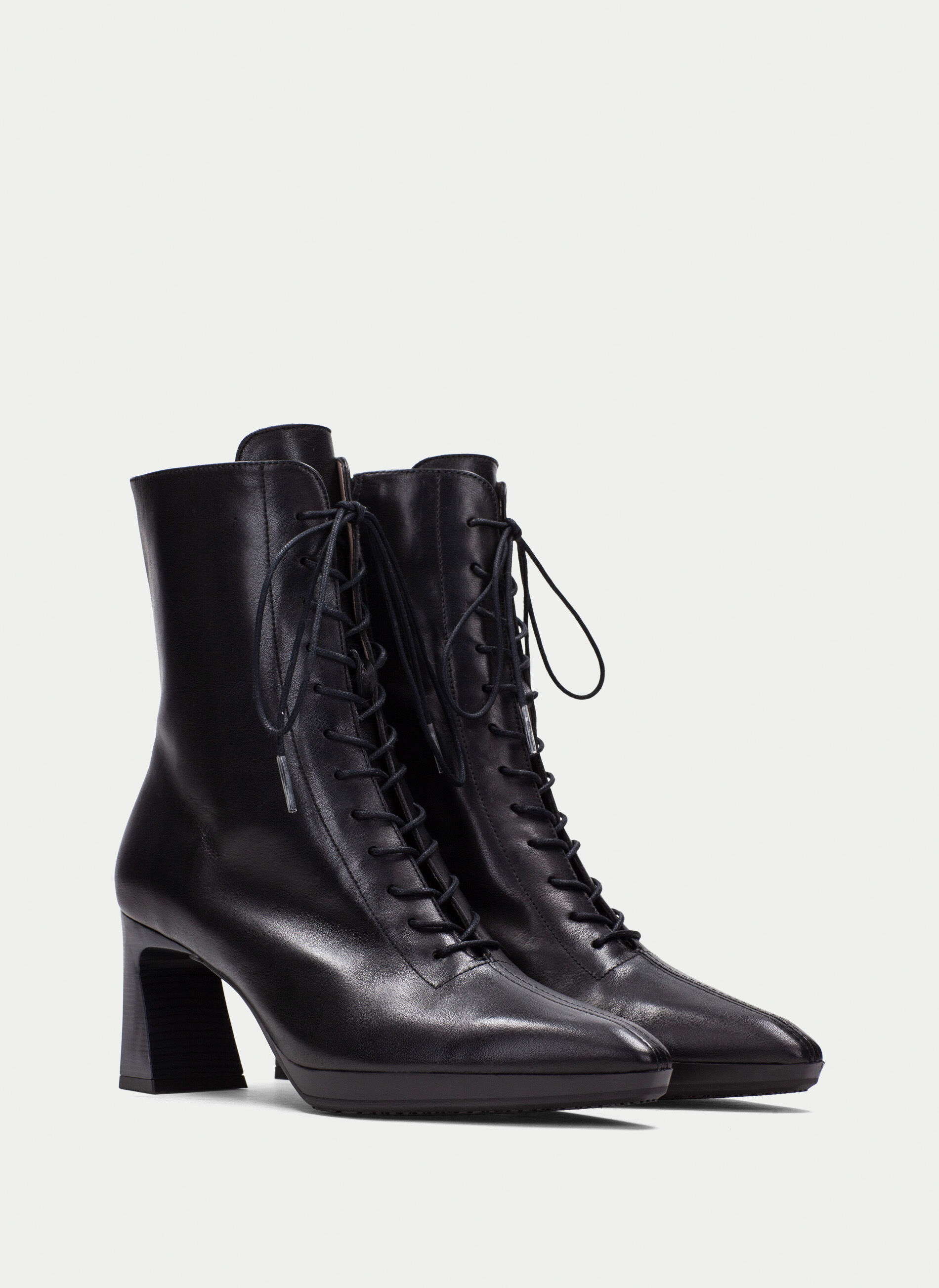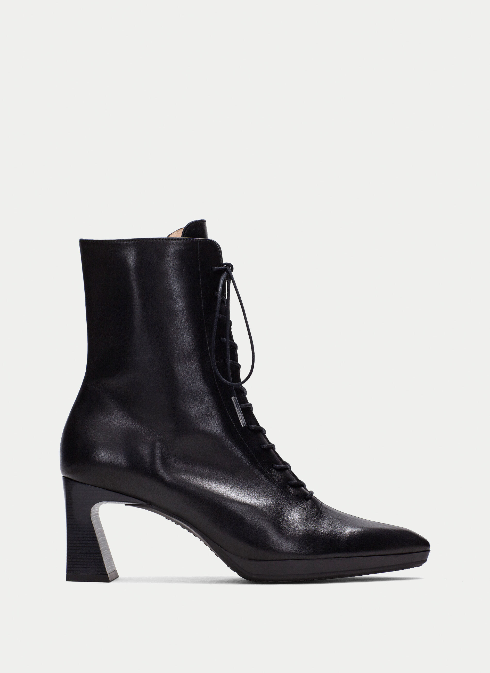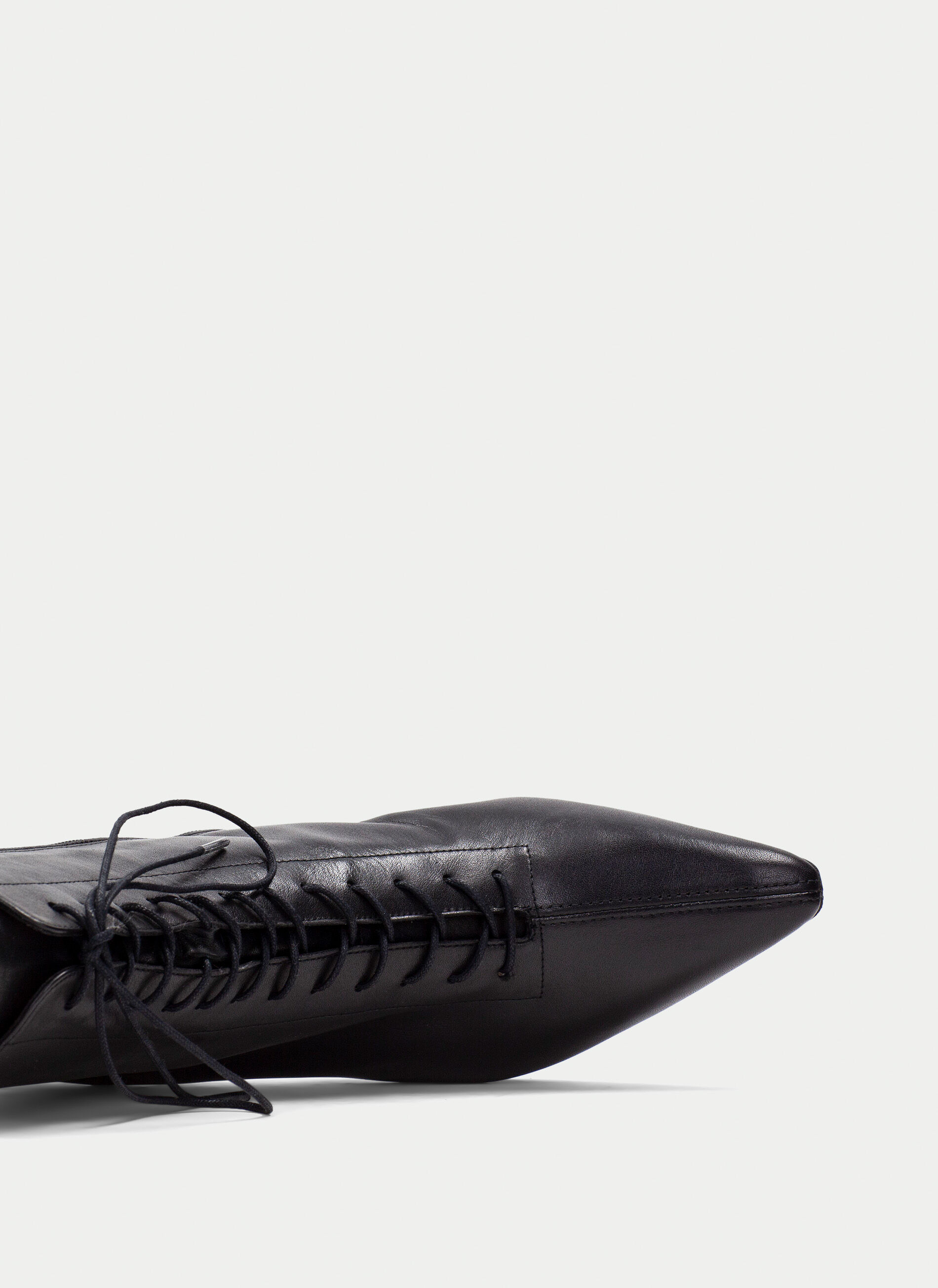 Stivaletto alla caviglia con lacci, punta affusolata e cerniera laterale per una facile calzata.